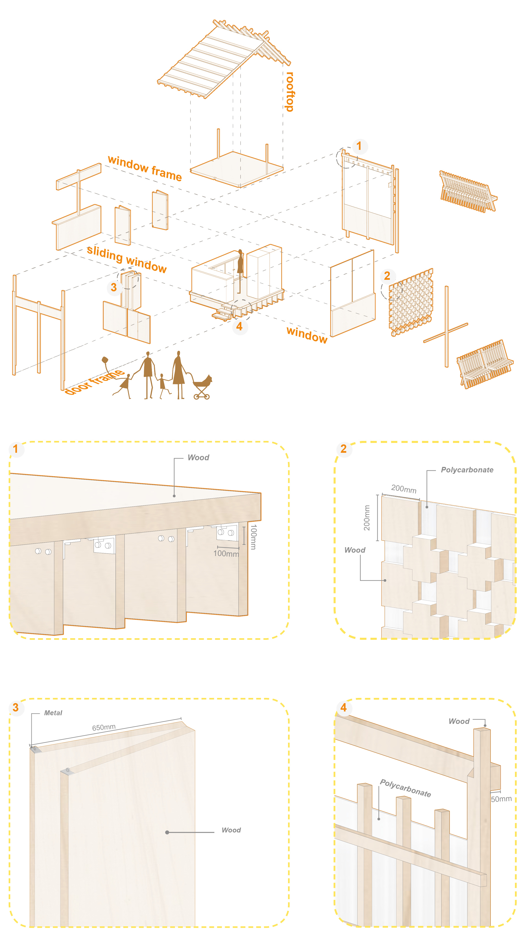 The entire building is made of wood and polycarbonate sheets. We took into account the need for storage for the three monomers, so the doors and windows of each individual unit can be completely closed and locked, as to ensure the safety of indoor belongings.